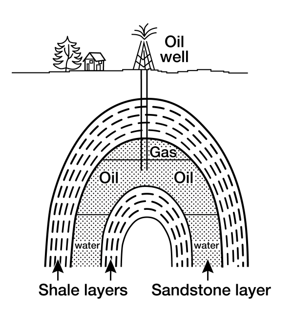 Oil and gas are low in density, float on water, and so tend to rise through water-filled pores in rocks and escape at natural seeps on land or beneath the sea. In some places such as off the U.S. Gulf of Mexico coast, biological communities have been found living on oil seeps on the sea floor. (Oil is natural, and nature uses oil in small quantities. But if a supertanker wrecks or an oil well blows out, nature cannot use all that oil at once, and problems result.) Because of the tendency for oil to escape, a large accumulation of oil can form only if there is a trap of some sort. Many different types of traps exist. For example, fluids do not pass through shale easily because it has only tiny spaces; if shale lying above sandstone is folded a little, oil and gas may be trapped in the sandstone layer, as shown in the figure.