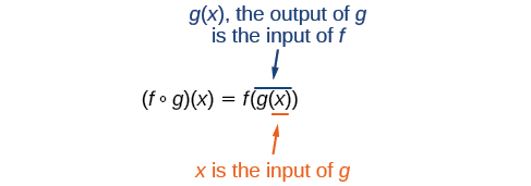 It is also important to understand the order of operations in evaluating a composite function. We follow the usual convention with parentheses by starting with the innermost parentheses first, and then working to the outside. In the equation above, the function g takes the input x first and yields an output g(x). Then the function f takes g(x) as an input and yields an output f(g(x)).