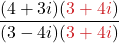 Multiply the numerator and denominator by the complex conjugate of the denominator. \displaystyle\frac{(4+3i) ({\color{myred1}{3 + 4i}})}{(3-4i) ({\color{myred1}{3 + 4i}})}