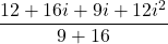 Simplify and write the result in standard form. Use the pattern (a − bi)(a + bi) = a2 + b2 in the denominator. \displaystyle\frac{12 +16i + 9i + 12i^2}{9 + 16}