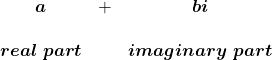 \[ \begin{array}{ccc} \boldsymbol{a} & + & \boldsymbol{bi}  &  \\ \text{\boldsymbol{real \;part}} & & \text{\boldsymbol{imaginary\; part}} & \end{array} \]