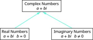 he diagram has a rectangle with the labels “Complex Numbers” and a plus b i. A second rectangle has the labels “Real Numbers”, a plus b i, b = 0. A third rectangle has the labels “Imaginary Numbers”, a plus b i, b not equal to 0. Arrows go from the Real Numbers rectangle and Imaginary Numbers rectangle and point toward the Complex Numbers rectangle.