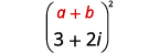 Use the Binomial Squares Pattern formula the quantity a plus b in parentheses squared equals a squared plus 2 a b plus b squared. Image shows parenthesis 3 with an a above it, plus 2i with a b above it, parenthesis and it is squared.