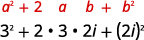 Applied to this example we get the expression 3 squared plus 2 times 3 times 2 i plus the quantity 2 i in parentheses squared.