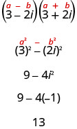 he quantity a minus b in parentheses times the quantity a plus b in parentheses is written above the expression showing the product of 3 minus 2 i in parentheses and 3 plus 2 i in parentheses. In the next line a squared minus b squared is written above the expression 3 squared minus the quantity 2 i in parentheses squared. Simplifying we get 9 minus 4 i squared. This is equal to 9 minus 4 times negative 1. The final result is 13.When we multiply complex conjugates, the product of the last terms will always have an i2 which simplifies to −1.